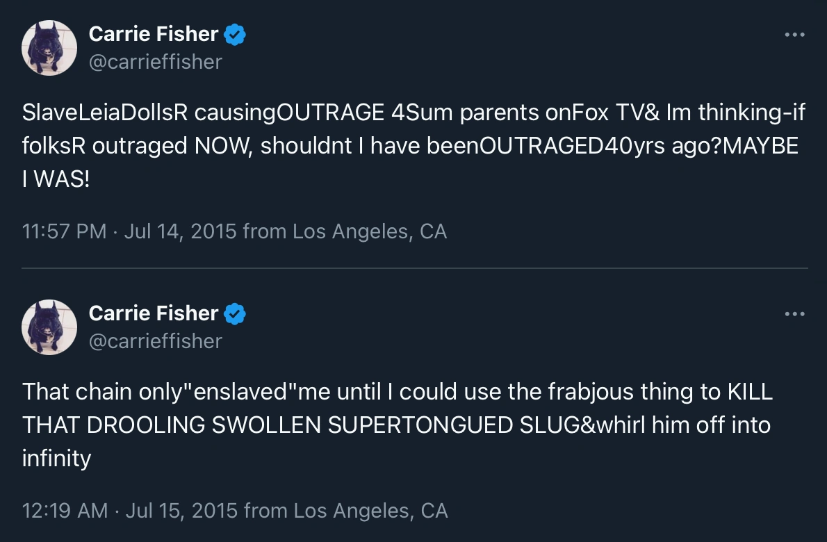 - ↑ 39.0 39.1 Carrie Fisher's Tweets: