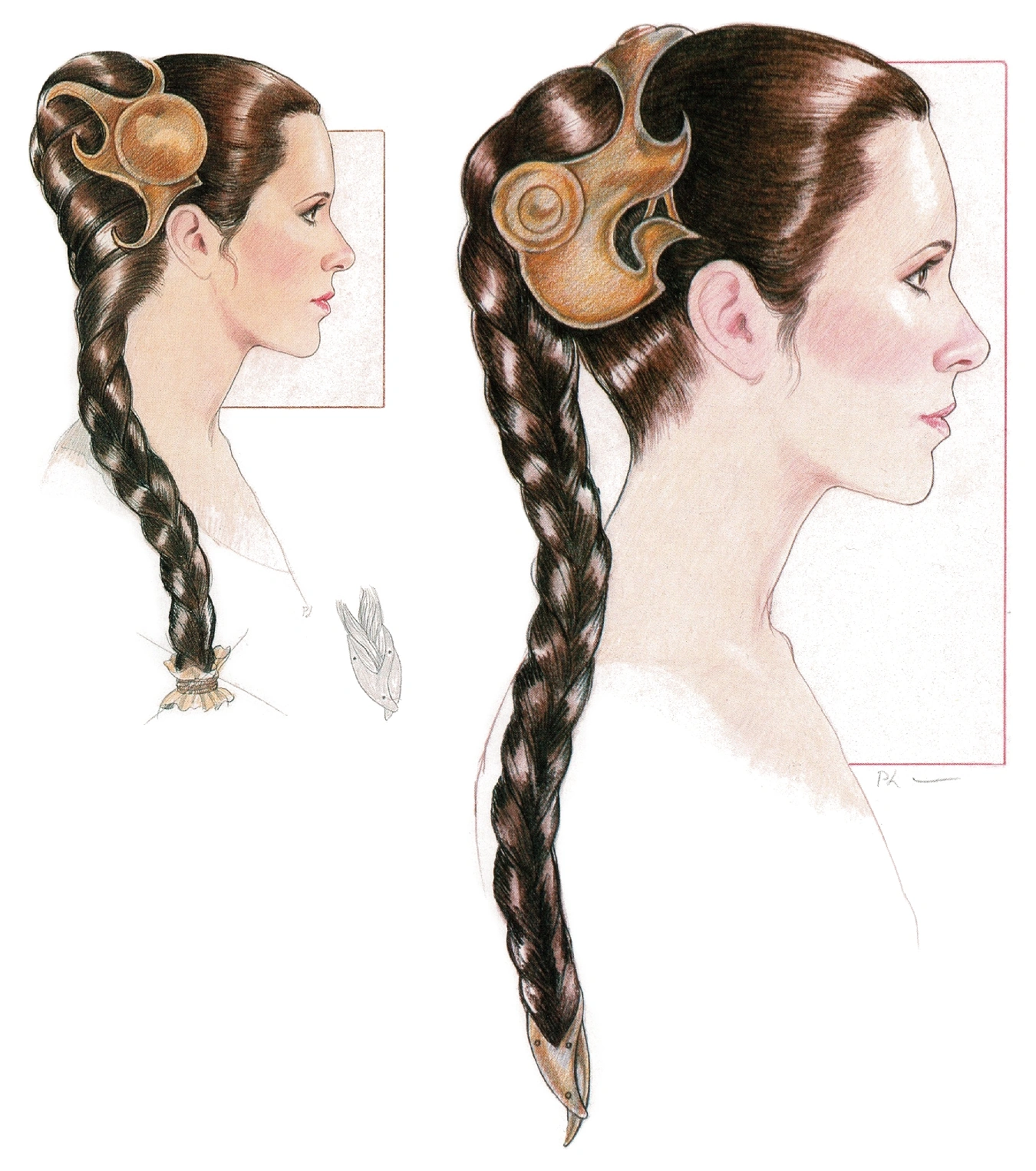 Leia's hairstyle was designed by Paul LeBlanc[web 5] as one of the hairdressers for the film,[7] along with Patricia McDermott, while artist Marilee Heyer illustrated LeBlanc's designs.[18] Heyer said LeBlanc was not an illustrator himself; he would sketch his designs but needed another artist to create polished illustrations to present the concepts, and she became that artist.[web 6][web 7] She worked at his direction from his sketches as well as portrait photographs of Fisher to capture her likeness. There is a misconception from the SFGATE feature on Heyer that she was a concept artist for the costume, but she was not part of that design process.[web 7]